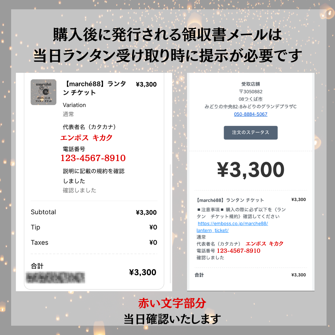 ・購入後に発行される領収書メールは 当日ランタン受け取り時に提示 が必要です。